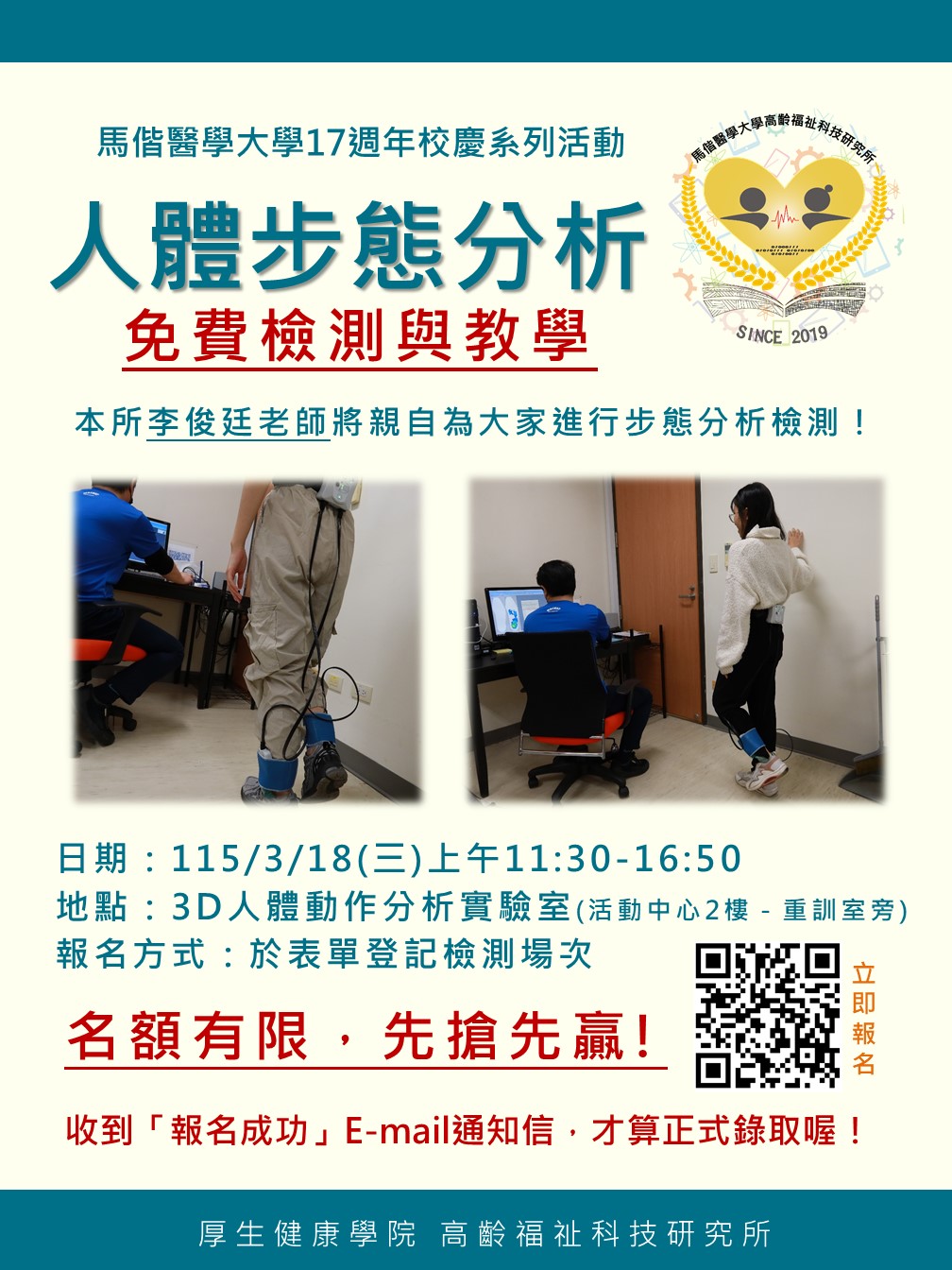 歡慶馬偕醫學大學17週年校慶,厚生健康學院-高齡福祉科技研究所特辦理「人體步態分析檢測活動」,誠摯邀請您報名參加 !