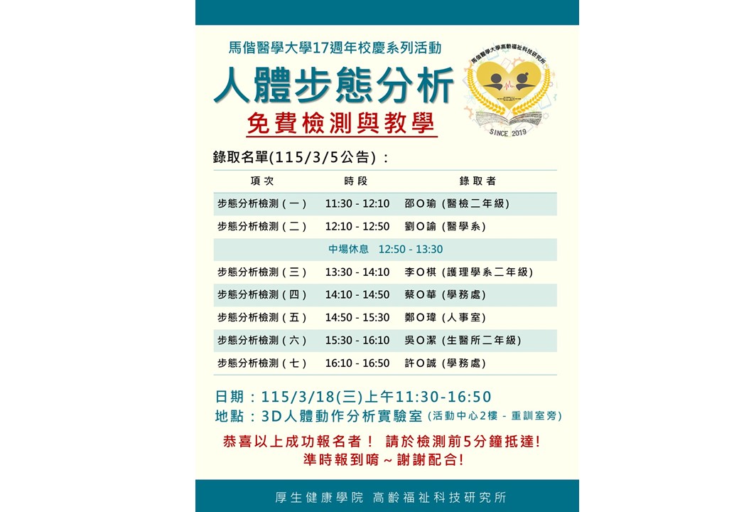 [2026/03/05]   【錄取名單公告】歡慶17週年校慶「人體步態分析檢測活動」,恭喜成功報名者!